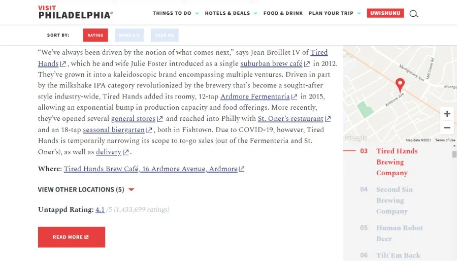 The Craft Beer Trail page on visitphilly.com was enhanced to provide additional features to users and to increase the overall usability and effectiveness of the page without increasing the page load speed. The primary goals of the enhancement were to boost Philadelphia’s image as one of the country’s best places for craft beer and to assist breweries by driving more visitors to visit their websites.